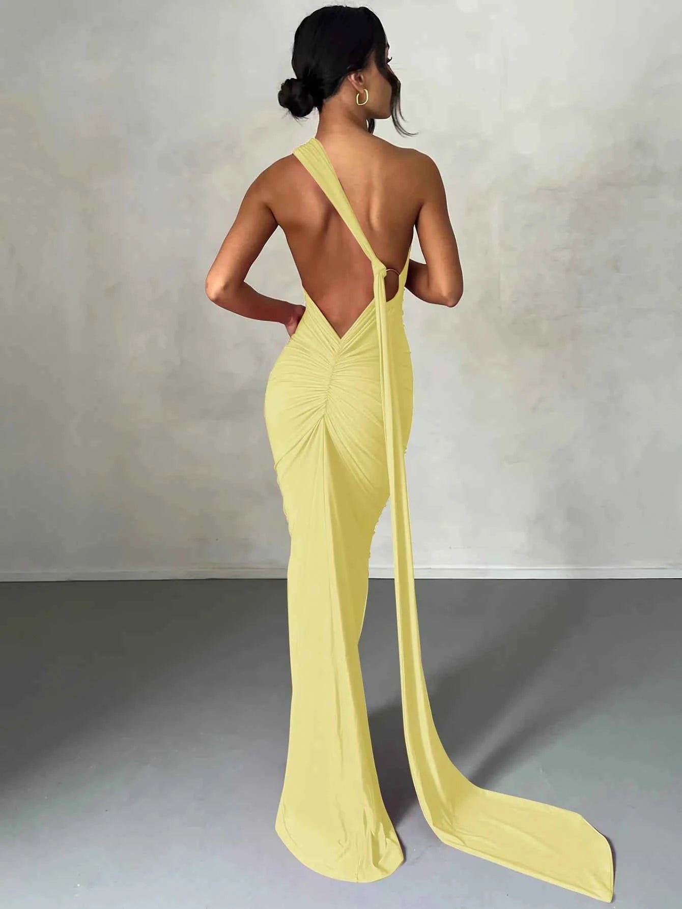 Hugcitar One Shoulder Backless Adjustable Scarf Loop Ruched Sexy Maxi